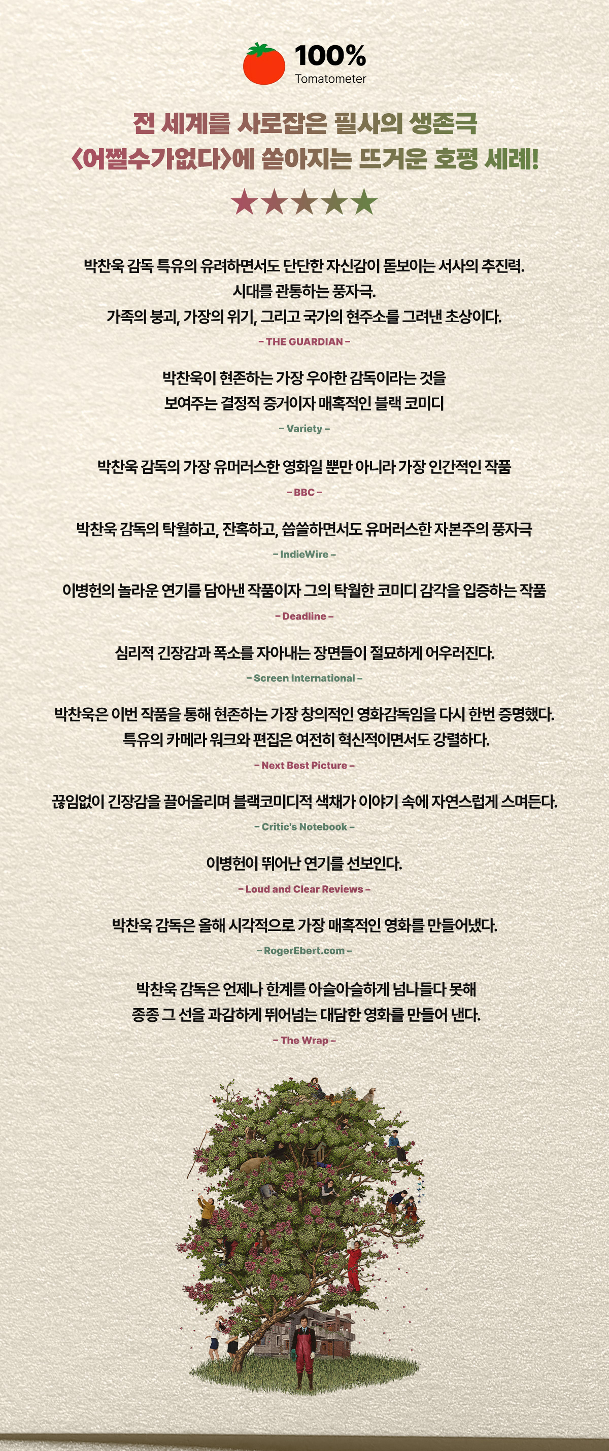 믿고 보는 배우들의 만남과 드라마틱한 전개, 아름다운 미장센, 견고한 연출, 그리고 블랙 코미디까지 더해진 박찬욱 감독의 새 영화 <어쩔수가없다>는 오는 9월 24일 개봉 예정이다.